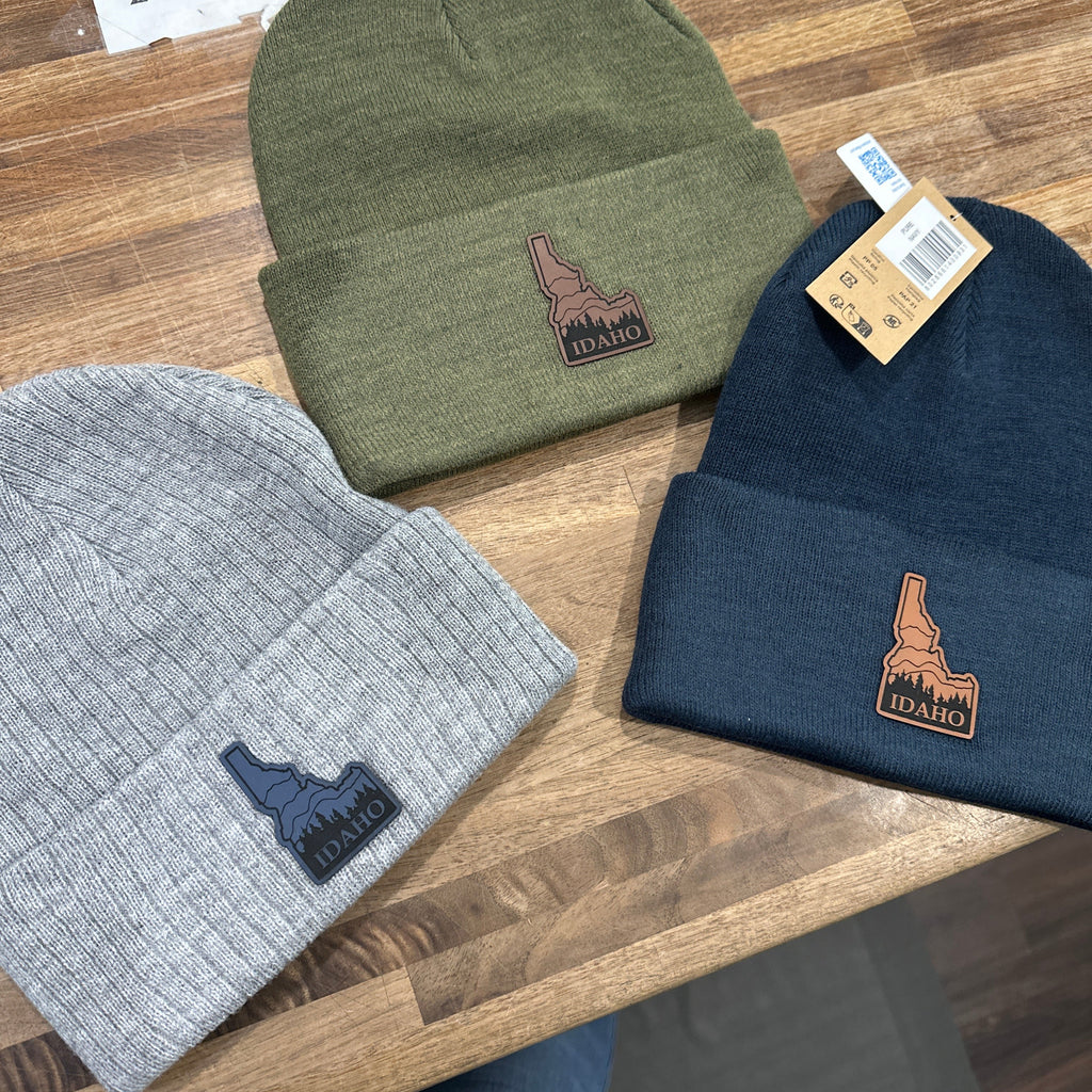 A brown leather Idaho mountain and tree patch on assorted colored beanies!