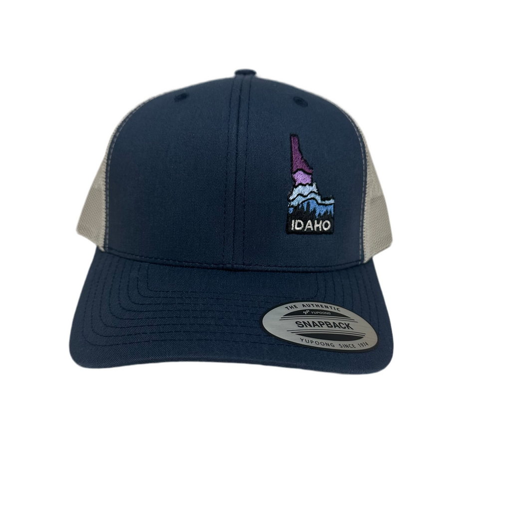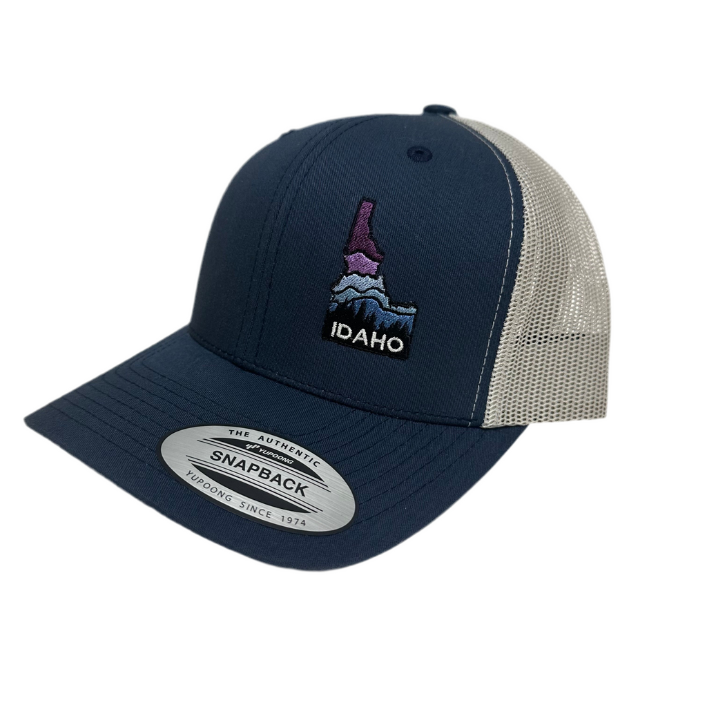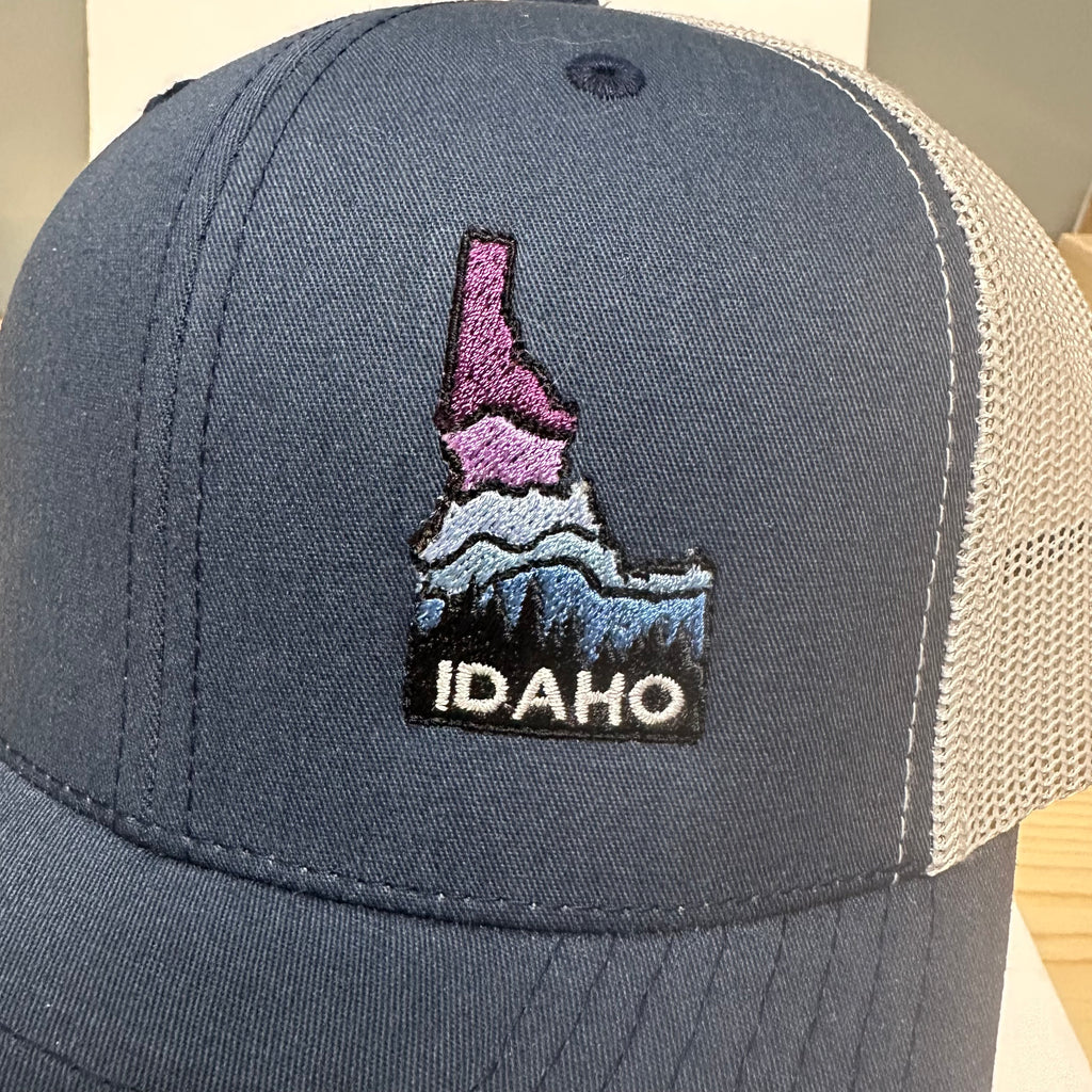 Our Idaho Mountain and Trees Design Embroidered on a Navy Adjustable Hat!