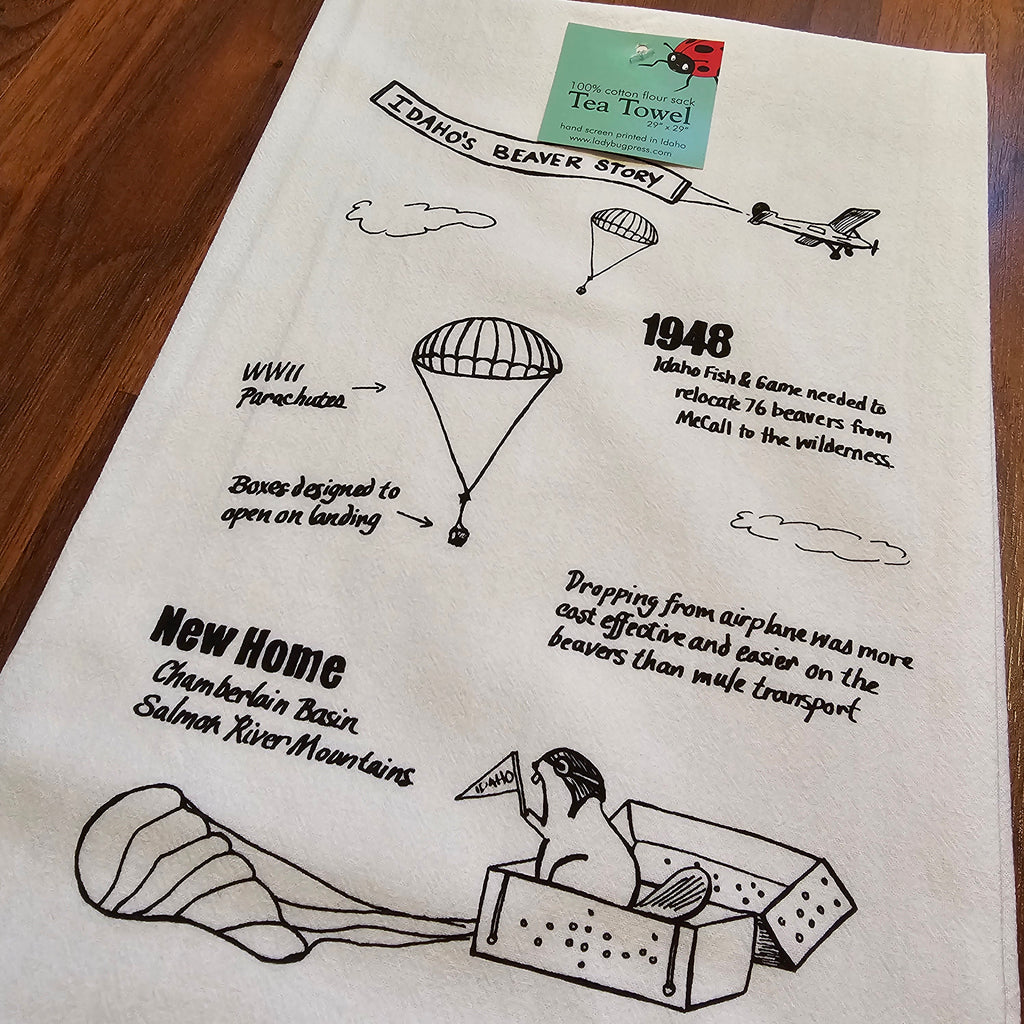 Idaho Parachuting Beavers, our tribute to the beaver drop of 1948 (true story!) Hand drawn, hand screen printed in charcoal on super soft, absorbent cotton flour sack towels!